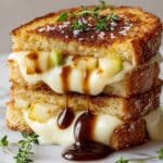 This Apple Butter Brie Grilled Cheese is a delicious twist on a classic sandwich, featuring creamy Brie cheese, sweet apple butter, and optional fresh apple slices and thyme for a perfect balance of flavors. Crispy sourdough bread is layered with buttery spread and cooked to golden perfection in a skillet, making an easy yet gourmet comfort food treat.