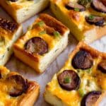 Delicious baked egg boats featuring a crusty baguette hollowed out and filled with a savory mixture of eggs, cheeses, scallions, and flavorful breakfast sausages. This hearty and visually appealing breakfast or brunch dish offers a perfect blend of creamy, cheesy, and spicy flavors baked to perfection.