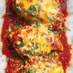 The image shows three pieces of chicken breast, each covered with a layer of melted orange cheddar cheese that has a slightly stretchy texture. Under the cheese, the chicken appears to be cooked with a slightly browned surface, visible around the edges. The chicken is placed in a thick, bright red tomato sauce that has a smooth texture with small bits, filling the white marbled surface around them. The dish is garnished with small leaves of fresh green cilantro and sprinkled with a fine dusting of white grated cheese scattered evenly over the top. photo taken with an iphone --ar 4:5 --v 7