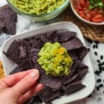 A woman's hand holds a single dark purple ridged chip with a chunky scoop of green guacamole topped with small pieces of yellow peppers or tomatoes. Below, there is a white dish filled with similar dark purple ridged chips. In the background, a transparent glass bowl contains more chunky green guacamole, and another bowl holds red salsa with a green herb garnish. The setting is on a white marbled surface with scattered black beans. Photo taken with an iphone --ar 4:5 --v 7