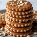A tall stack of seven round cookies with scalloped edges layered with smooth, shiny caramel in between each cookie, creating a rich, glossy brown filling that slightly drips out at the edges. The top cookie is fully covered in the same caramel and sprinkled generously with small, uneven chunks of light tan peanuts. The stack sits on a white plate with a rim, against a white marbled texture background, and there are a few peanut pieces scattered nearby. photo taken with an iphone --ar 4:5 --v 7