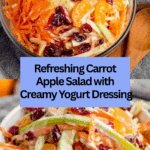 A refreshing carrot apple salad combining sweet and tangy flavors, with crunchy matchstick carrots, crisp apples, dried cranberries, and mandarin segments, all tossed in a creamy vanilla yogurt and mayo dressing. Perfect as a light side dish or healthy snack.
