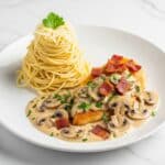 Cheesecake Factory Chicken Riesling is a creamy, flavorful dish combining tender chicken thighs simmered in dry Riesling wine with sautéed pancetta, garlic, onions, and mushrooms. Finished in the oven with rich heavy cream, this comforting meal offers a perfect blend of savory and subtle wine notes, garnished with fresh parsley for a delightful presentation.