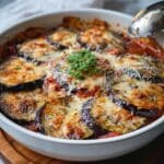 A deliciously creamy and cheesy baked eggplant casserole featuring layers of tender roasted eggplant, rich tomato sauce, and a blend of mozzarella, Parmesan, and ricotta cheeses. This comforting dish combines Mediterranean flavors with a smooth texture, perfect as a hearty vegetarian main or side.