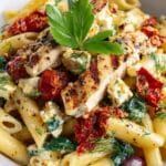 This Chicken Feta Greek Pasta is a vibrant and flavorful dish combining tender chicken, tangy feta, and a medley of Mediterranean vegetables tossed with perfectly cooked penne pasta. It’s a quick and satisfying meal that brings the fresh tastes of Greece to your dinner table.