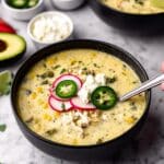 A creamy soup served in a black bowl, filled with a yellowish broth containing small chunks of corn, green vegetables, and shredded chicken. On top, there are three thinly sliced pink and white radish pieces arranged next to two green jalapeño slices, a crumbly white cheese portion, and a lime slice partially submerged in the soup. The soup has a light frothy texture and a sprinkle of fresh green herbs. A silver spoon rests inside the bowl on the right side. The bowls are placed on a white marbled surface, with glimpses of toppings in small white dishes and a halved avocado nearby. Photo taken with an iphone --ar 4:5 --v 7