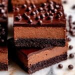 Decadent and rich Chocolate Cheesecake Bars featuring a crunchy Oreo crust, creamy chocolate cheesecake filling, and a smooth chocolate ganache topping. Perfectly balanced chocolate flavors come together in an easy-to-make layered dessert ideal for any occasion.