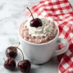 This Chocolate Covered Cherry Hot Chocolate is a festive twist on a classic winter favorite. Creamy milk chocolate hot cocoa is elevated with a splash of maraschino cherry juice and topped with luscious chocolate covered cherries. It’s a delightful treat that’s perfect for cozy evenings.