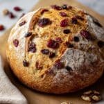 This Cranberry Walnut Bread is a delightful, rustic loaf featuring the natural sweetness of dried cranberries and the crunch of walnuts. Perfectly crusty on the outside and tender on the inside, this no-knead bread relies on a long fermentation for enhanced flavor and texture. Baked in a Dutch oven, it yields a beautiful artisan-style bread ideal for breakfast, sandwiches, or snacking.