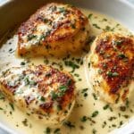 - Bake the chicken with sauce: Place the seared chicken breasts into the prepared baking dish. Pour the creamy sauce evenly over the chicken, making sure they are well coated. Bake uncovered for 25 to 30 minutes, or until the chicken reaches an internal temperature of 165°F (74°C), ensuring it is cooked through.