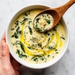 A creamy light yellow soup filled with small, fresh dark green herb pieces is shown in a white bowl. On top of the soup, there are swirls of melted yellow butter and a sprinkle of black pepper. A wooden spoon filled with the soup and herbs is partially dipped in the bowl, held by a woman's hand. The background is a white marbled texture. photo taken with an iphone --ar 4:5 --v 7