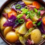 A close-up view of a bowl filled with corned beef and cabbage stew showing several thick layers: the bottom layer has light yellow baby potatoes halved, some orange carrot slices, and bits of cooked light green cabbage; the middle layer has pieces of rich purple cabbage and tender pinkish corned beef chunks; the top layer is garnished with bright green sliced scallions and a light broth that glistens with herbs and black pepper, all contained in a dark brown bowl on a white marbled surface. photo taken with an iphone --ar 4:5 --v 7