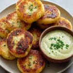 A white plate holds ten small, round potato cakes stacked in two layers, with the top layer showing golden-brown, crispy textures and small green herb pieces sprinkled on the surface, emphasizing their cooked finish. On the right side of the plate, there is a small brown bowl filled with a creamy, pale green dipping sauce, topped with finely chopped green herbs. The background is a white marbled texture, creating a clean and simple setting. Photo taken with an iphone --ar 4:5 --v 7