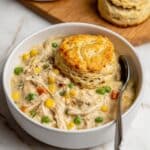 A white bowl filled with a thick chicken and vegetable stew, showing shredded chicken pieces, bright yellow corn, green peas, and small chunks of orange carrot in a creamy, light beige sauce. On top of the stew, there is a golden-brown biscuit with a flaky, layered texture. A silver spoon rests inside the bowl on the right side, and in the background, there is another biscuit on a wooden surface, all set against a white marbled background. photo taken with an iphone --ar 4:5 --v 7
