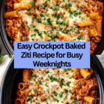 This Crockpot Baked Ziti is a convenient and comforting Italian-American dish made by layering uncooked ziti pasta with marinara sauce, ricotta, mozzarella, and Parmesan cheese, slow-cooked to perfection in a crockpot. It offers a hands-off approach to a classic baked pasta meal with rich flavors and a cheesy, tender finish, ideal for busy days or family dinners.