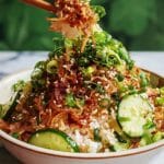 - Serve: Transfer the salad into serving bowls and garnish with toasted sesame seeds and sliced green onions for an added crunch and fresh flavor.