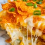 6. Add Toppings: Sprinkle the crumbled Doritos over the top of the mixture. Then, sprinkle the remaining 1 cup of shredded Mexican cheese blend and the reserved ¼ cup of chopped green onions evenly on top of the Doritos layer.