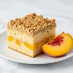 A square piece of peach crumb cake sits on a white plate, showing three distinct layers: a soft, light yellow cake base with visible peach chunks embedded inside, topped with a golden-brown crumbly oat streusel layer that looks crunchy and textured. Next to the cake is a fresh peach wedge with a smooth yellow and pink skin and juicy orange flesh. The white plate rests on a white marbled surface, giving a clean and bright look to the image. Photo taken with an iphone --ar 4:5 --v 7