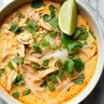 This Easy Thai Chicken Curry Soup is a flavorful and comforting dish that combines tender shredded chicken, fragrant Thai red curry paste, creamy coconut milk, and fresh herbs. Perfect for a quick weeknight meal, it features rice noodles simmered in a vibrant curry broth with a hint of lime, garnished with basil, cilantro, and scallions for a fresh finish.