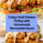 This Fried Chicken Po’Boy recipe features crispy chicken nuggets nestled in soft New Orleans-style French bread, layered with fresh lettuce, tomato slices, spicy pickles, and a flavorful homemade remoulade sauce. Perfectly toasted bread and a zesty remoulade bring together a classic, hearty sandwich that’s messy, extravagant, and utterly delicious.