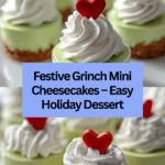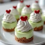 This playful Grinch Mini Cheesecake recipe is a festive dessert perfect for holiday gatherings. Featuring a buttery graham cracker crust topped with a creamy, vibrant green cheesecake filling, these mini cheesecakes are as delicious as they are whimsical. Decorated with whipped cream and red heart-shaped candies, they capture the spirit of the Grinch in a bite-sized treat.