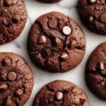 The image shows several round chocolate cookies arranged closely on a white marbled surface. Each cookie has a rich, dark brown base with a slightly cracked texture and is topped with smooth, shiny, round chocolate chips scattered evenly over the top. The cookies have a soft, moist look with a bit of a rough surface, and the chocolate chips stand out with their glossy, firm texture. The lighting highlights the different textures and the deep chocolate tones of the cookies and chips. photo taken with an iphone --ar 4:5 --v 7
