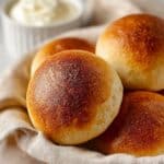 A close-up image of four golden-brown bread rolls with a shiny, slightly textured crust. They are placed in a wicker basket lined with a soft beige cloth. The basket sits on a white marbled surface. In the blurred background, there is a white ramekin filled with a white creamy spread. The lighting highlights the warm tones of the bread rolls, showing their round shape and smooth texture. photo taken with an iphone --ar 4:5 --v 7