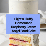 This homemade Raspberry and Cream Angel Food Cake is a light and airy dessert layered with rich mascarpone cream and tart raspberry preserves. Finished with a glossy Italian meringue topping, it’s a show-stopper that tastes as delightful as it looks.
