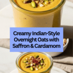 This Indian-Style Overnight Oats recipe offers a delightful and nutritious twist on traditional overnight oats. Infused with aromatic spices like cardamom and saffron, combined with creamy yogurt, chia seeds, and a hint of rose water, these oats create a luscious, flavorful breakfast that’s ready to enjoy with minimal morning effort. Topped with crunchy pistachios, it’s a perfect blend of texture and taste to start your day.