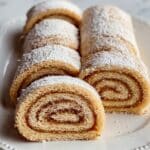 The image shows four rolled cakes placed side by side on a white plate with a decorative edge, sitting on a white marbled surface. Each roll has a light golden-brown outer layer covered with a dusting of powdered sugar, giving a soft, powdery texture. Inside, the rolls display multiple thin layers of cake and a light brown filling spiraled tightly, showing a contrast between the creamy cake and the slightly darker filling. The rolls look moist and soft, with the layers clearly visible and evenly spaced. photo taken with an iphone --ar 4:5 --v 7