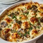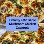 A rich and creamy Keto Garlic Mushroom Chicken Casserole packed with tender chicken, sautéed mushrooms, and a blend of cheeses, delivering comfort food that fits perfectly into a low-carb ketogenic diet.