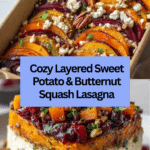This layered sweet potato, butternut squash, and carrot lasagna is a vibrant and comforting dish perfect for fall dinners. With tender roasted vegetables, creamy feta, crunchy walnuts, and a tangy cranberry-honey glaze, it offers a unique twist on classic lasagna. It’s both hearty and wholesome, making it a great vegetarian main course.