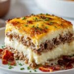 A comforting layered meatloaf recipe topped with creamy mashed potatoes and melted cheddar cheese, perfect for a hearty family dinner. This dish combines seasoned ground beef baked to perfection, a smooth mashed potato layer mixed with sour cream and butter, and a golden cheesy crust, creating a flavorful and satisfying meal.