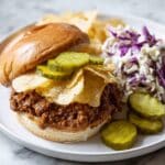 This Minnesota Sloppy Joe recipe puts a unique twist on the classic sloppy joe by combining ground beef with ketchup, mustard, and creamy mushroom soup for a rich and flavorful filling. It’s simmered slowly to blend the flavors perfectly and traditionally topped with crispy potato chips and dill pickles for contrasting textures. A comforting and nostalgic sandwich that’s perfect for casual meals.