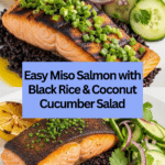 Keywords: miso salmon, black rice, coconut cucumber salad, baked salmon recipe, Asian-inspired salmon, healthy salmon dish, miso marinade
