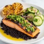 - Assemble and Serve: On each plate, start with a base of black rice, then place a baked salmon fillet on top. Add a generous helping of the coconut cucumber salad on the side. Serve immediately and enjoy the harmonious blend of flavors and textures.