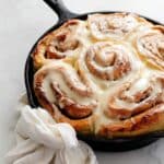 A large cinnamon roll is shown in a black cast iron skillet on a white marbled surface. The cinnamon roll has multiple thick layers, spiraled from the center outward with a soft golden-brown color and visible cinnamon specks. It is covered with a creamy white glaze that drips down the sides and fills the crevices between the layers, giving a smooth, glossy texture. The skillet handle is wrapped with a loosely tied white cloth. photo taken with an iphone --ar 4:5 --v 7