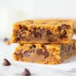 The image shows two stacked thick squares of a soft, chewy cookie bar with a golden-brown exterior and a moist, slightly gooey interior that is packed with melted dark brown chocolate chips and small pieces of orange-colored butterscotch chips. The texture looks dense with the chocolate chips slightly glossy and partially melted, embedded evenly throughout each cookie layer. The bars rest on a piece of white parchment paper placed on a white marbled surface, with one loose chocolate chip nearby. The background is bright and white, keeping the focus on the close-up dessert. Photo taken with an iphone --ar 4:5 --v 7