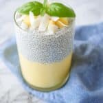 A clear glass shows a two-layered dessert placed on a white marbled surface covered partly by a blue and white cloth. The bottom layer is a thick, smooth yellow cream filling half of the glass. The top layer is a speckled light gray chia pudding, filling the other half. On top, white coconut flakes and light yellow fruit pieces sit under a fresh green basil leaf for garnish. Photo taken with an iphone --ar 4:5 --v 7