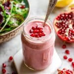 This vibrant Pomegranate Dressing, also known as Pomegranate Vinaigrette, is a tangy and subtly sweet salad dressing made from fresh pomegranate seeds, olive oil, pure maple syrup, lemon juice, white balsamic vinegar, and dijon mustard. Blended to a smooth consistency, this dressing infuses your salads with a burst of fruity flavor and a touch of fall and winter warmth.