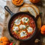 Pumpkin Shakshuka is a delightful twist on the traditional North African dish, featuring baked eggs poached in a spiced pumpkin and fire-roasted tomato stew. This hearty and flavorful breakfast or brunch option combines smoky paprika, cumin, and a hint of heat from crushed red pepper flakes with the natural sweetness of pumpkin, all cooked in a cast iron skillet and finished with fresh parsley for a comforting meal.