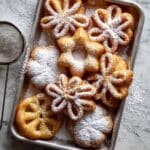 - Add Cinnamon Sugar: Sift together the confectioners’ sugar and ground cinnamon. Once the rosettes have cooled, generously sprinkle them with the cinnamon-sugar mixture for a sweet and flavorful finish. Serve and enjoy.