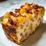 A thick slice of baked savory cake sits on a white plate, showing two main layers. The bottom layer is a light, creamy, and soft texture with small pieces of pink bacon embedded inside. The top layer is golden brown with a crispy, slightly rough texture and scattered chunks of yellow potato and more pieces of bacon that are reddish and caramelized. The edges are darker and slightly burnt, contrasting with the lighter center, all placed on a white marbled surface. Photo taken with an iphone --ar 4:5 --v 7