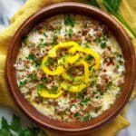 This Savory Orzo Stuffed Banana Peppers Soup is a comforting blend of creamy, cheesy broth and tender orzo pasta, packed with the bold flavors of Italian sausage and banana peppers. It’s a unique twist on traditional stuffed peppers, transformed into a hearty and delicious soup perfect for any season.