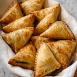 A basket lined with a white cloth holds many golden-brown triangular pastries. Each pastry is made of flaky, layered dough with a shiny, slightly glossy top crust. The crimped edges show a pattern of small indentations made by a fork, sealing the pastries well. Peeking out from some edges is a dark green filling, suggesting a vegetable or herb stuffing. The pastries are arranged closely, overlapping slightly, creating a warm, inviting look. The setting is on a white marbled texture surface. photo taken with an iphone --ar 4:5 --v 7