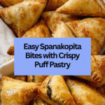 This Spanakopita recipe with puff pastry offers a delightful twist on the traditional Greek spinach pie. Using crisp, flaky puff pastry instead of the usual phyllo dough, this dish combines sautéed spinach and herbs with creamy feta cheese, all baked into perfectly portioned mini bites. Ideal as an appetizer or snack, these golden, savory pastries are easy to prepare and bursting with Mediterranean flavors.