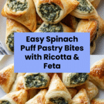 This Spinach Puff Pastry recipe features flaky puff pastry filled with a flavorful mixture of sautéed onions, garlic, spinach, ricotta, feta, and Parmesan cheeses, lightly seasoned with nutmeg and black pepper. Baked to golden perfection, these savory pastries make a delicious appetizer, snack, or light meal that’s easy to prepare and impressively tasty.