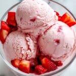 4. Serve: Once frozen, scoop the strawberry Greek frozen yogurt into bowls and optionally garnish with extra chopped fresh strawberries for added texture and flavor.