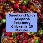 A vibrant and flavorful Sweet and Spicy Jalapeno Raspberry Chicken recipe ready in just 25 minutes. Juicy chicken thighs are perfectly seared and glazed with a luscious raspberry sauce infused with garlic, Dijon mustard, and a kick of jalapeno heat, making this dish a delightful balance of sweet, tangy, and spicy flavors.