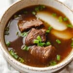 This comforting Korean Winter Soup features a rich and flavorful beef short rib broth simmered with aromatic vegetables and ginger. Perfect for cold days, this nourishing soup combines tender beef and mellow radish slices, seasoned with traditional Korean soy sauce to deliver a hearty and warming meal.